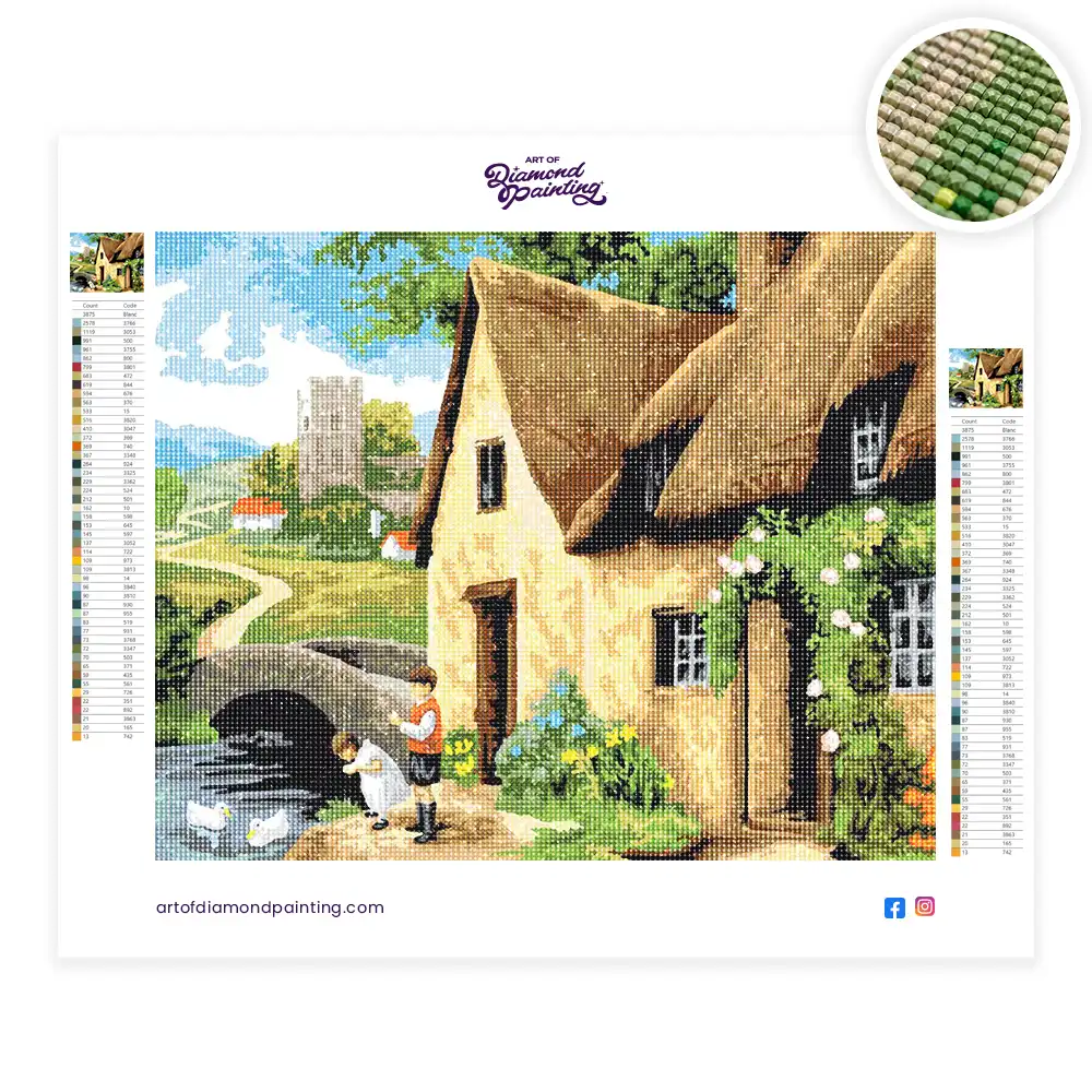 This Cottage by the river diamond painting kit contains all the necessary materials to create your artwork