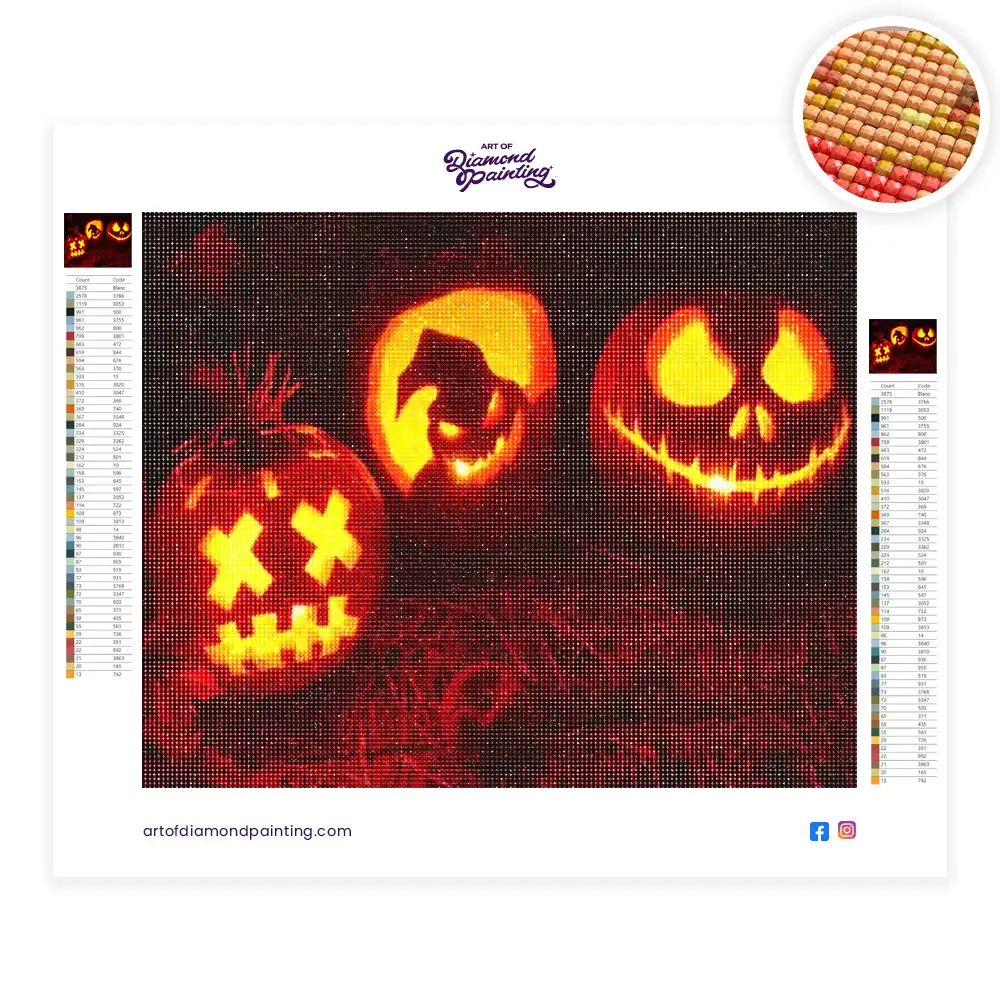 Creepy Halloween Pumpkins diamond painting diamond painting is an awesome way to begin your painting journey. A journey full of colours that sometimes comes with lots of patience, passion, and planning. But, always with love. At the conclusion of each day, it provides a gratifying sensation that enhances your self-assurance as you realize your own accomplishments. So why delay any further? Simply make your purchase and begin today.