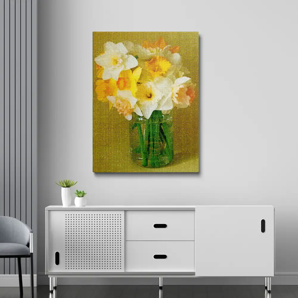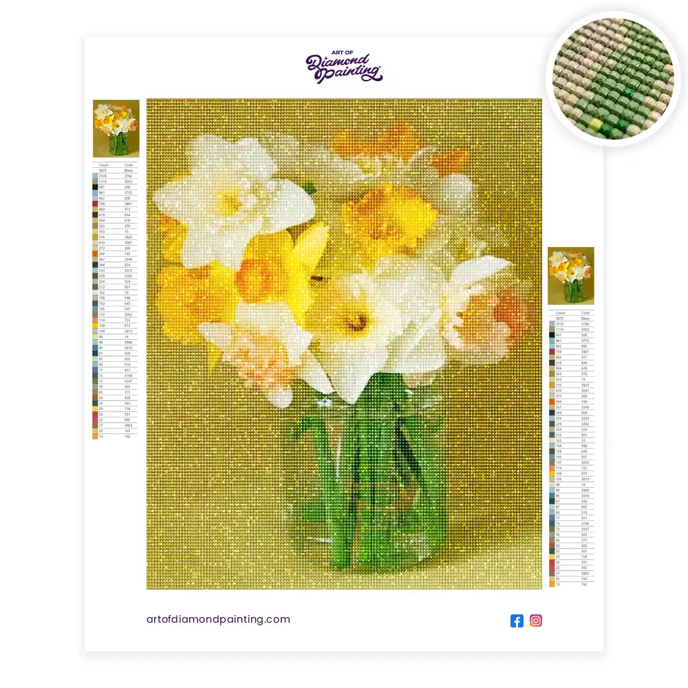 This Daffodils flowers diamond painting kit contains all the necessary materials to create your artwork