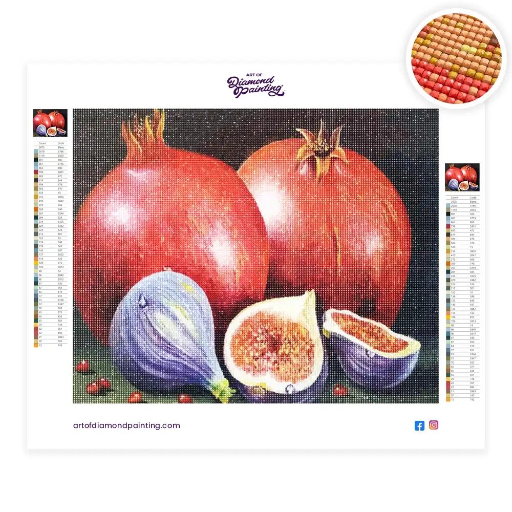 Figs and pomegranates diamond painting diamond painting is an awesome way to begin your painting journey. A journey full of colours that sometimes comes with lots of patience, passion, and planning. But, always with love. At the conclusion of each day, it provides a gratifying sensation that enhances your self-assurance as you realize your own accomplishments. So why delay any further? Simply make your purchase and begin today.