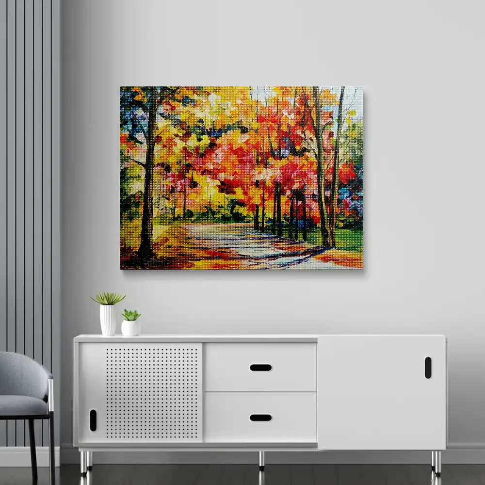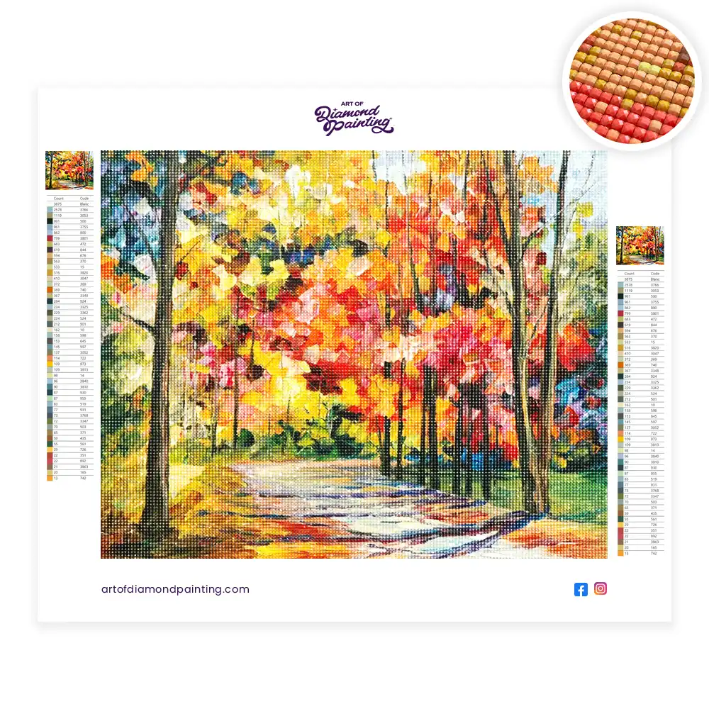 This Gold October diamond painting kit contains all the necessary materials to create your artwork