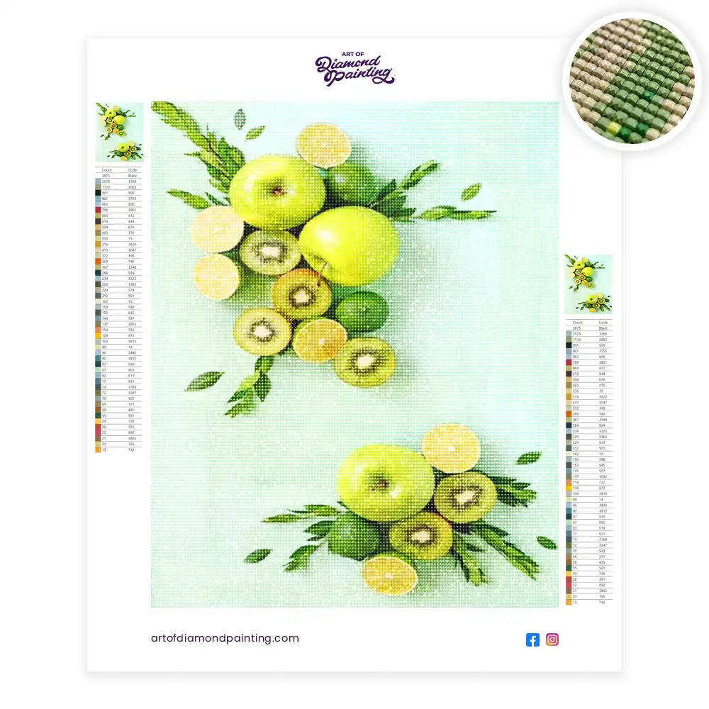 This Green fruits diamond painting kit contains all the necessary materials to create your artwork