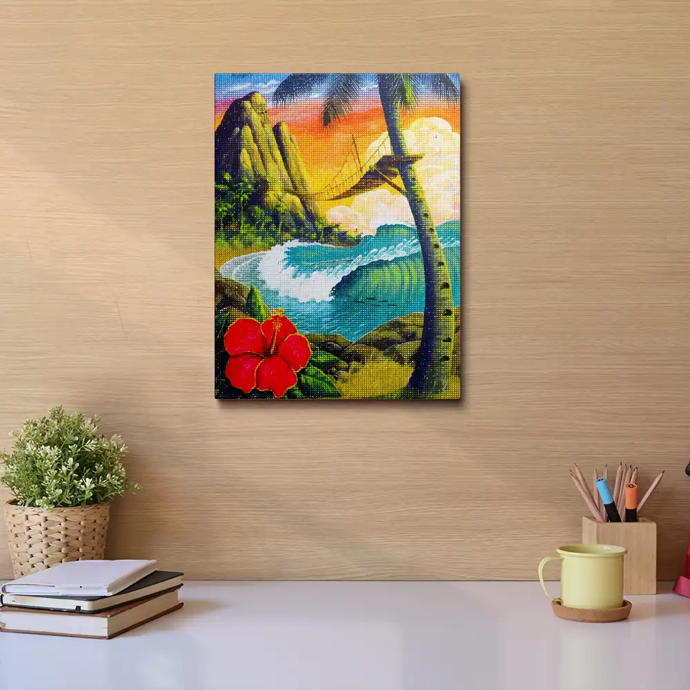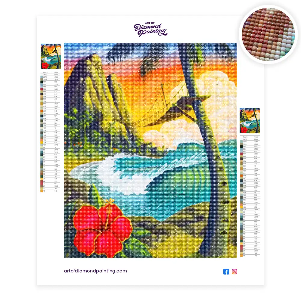 This Hawaiian Tropical Island diamond painting kit contains all the necessary materials to create your artwork