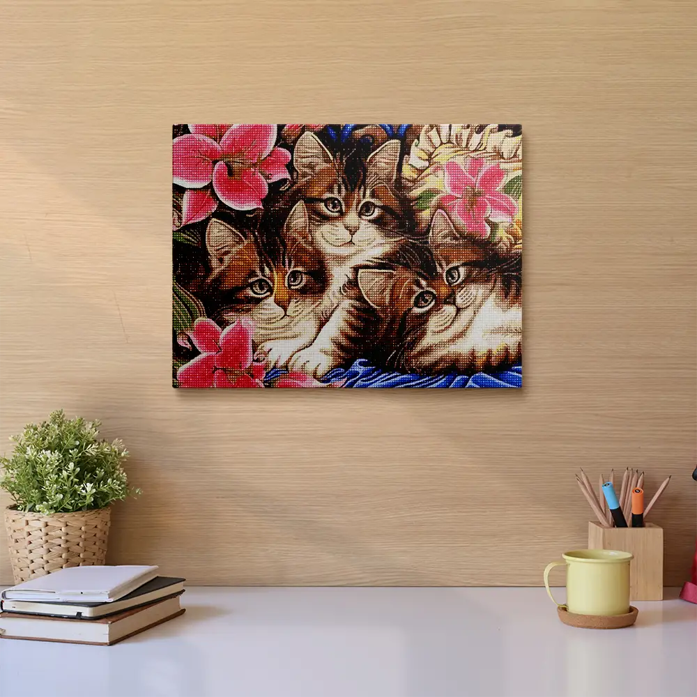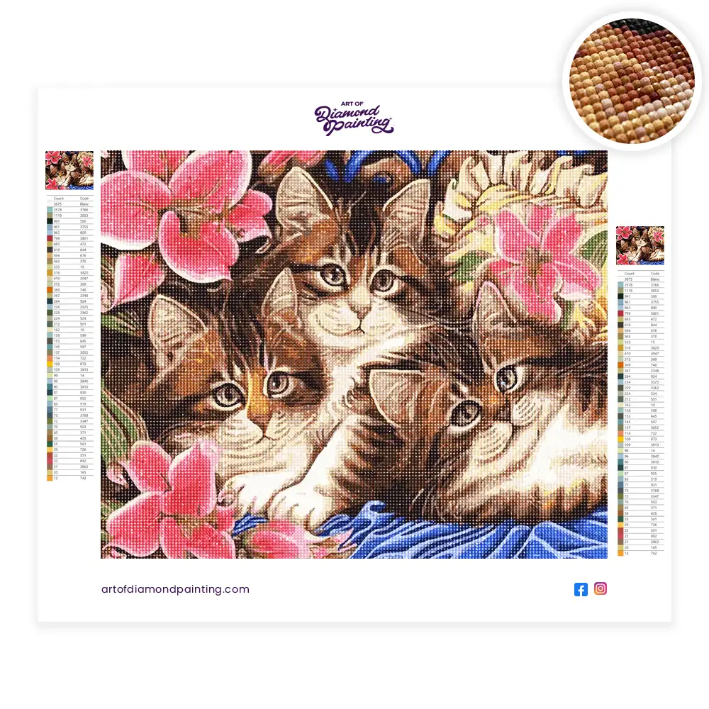 This Kittens and Flowers diamond painting kit contains all the necessary materials to create your artwork