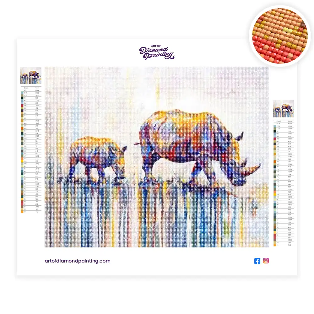 Mother and baby rhino diamond painting diamond painting is an awesome way to begin your painting journey. A journey full of colours that sometimes comes with lots of patience, passion, and planning. But, always with love. At the conclusion of each day, it provides a gratifying sensation that enhances your self-assurance as you realize your own accomplishments. So why delay any further? Simply make your purchase and begin today.