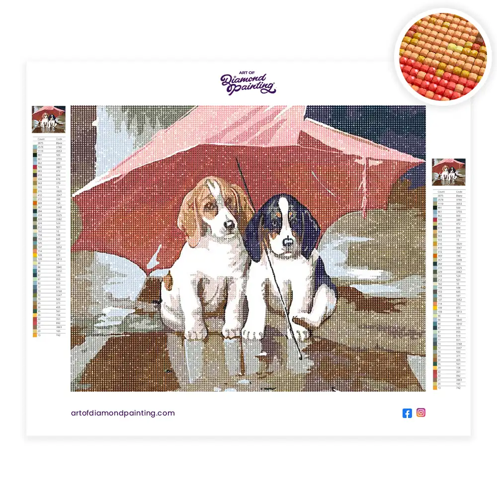This Puppies under an Umbrella diamond painting kit contains all the necessary materials to create your artwork