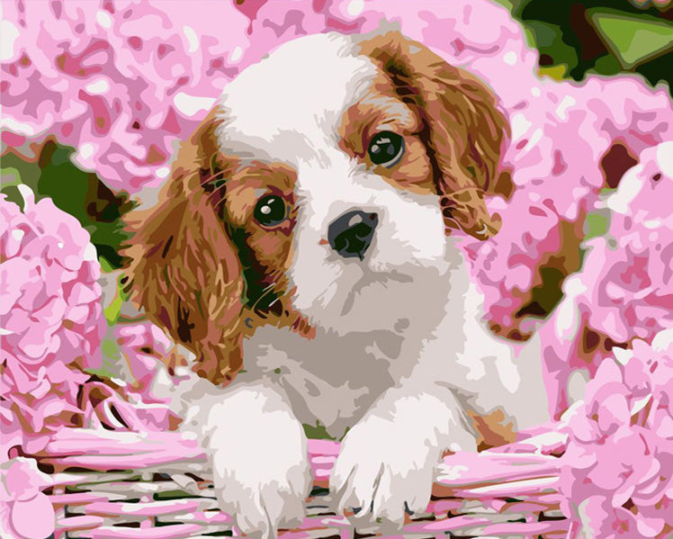 This Puppy in Pink Flower Basket diamond painting kit contains all the necessary materials to create your artwork