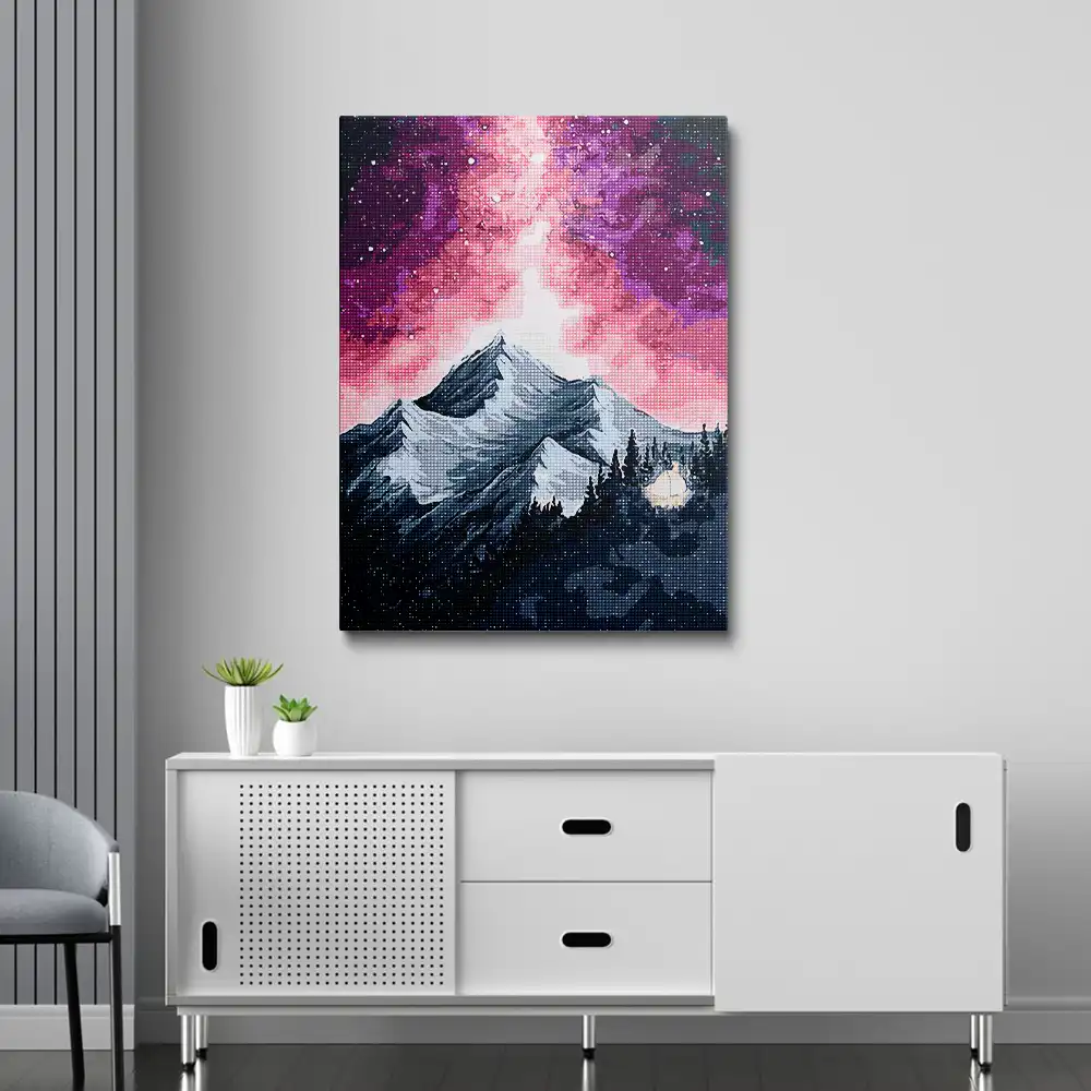 This Purple shining sky and mountains diamond painting kit contains all the necessary materials to create your artwork