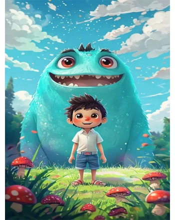 Joyful boy and friendly turquoise monster